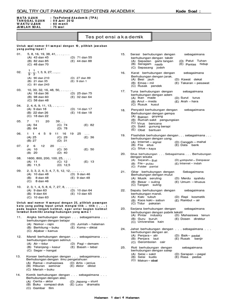 Tes potensi akademik (tpa) / tes bakat skolastik (tbs) 2019 persiapan pbs ugm, utul um ugm, pmbt itb, & utbk sbmptn 2019 *free download, tidak untuk dijual kode soal: 101. Utbk tahun ini terjadi penyingkatan waktu ujian dan meniadakan potensi akademik. hal itu sebagai langkah penyesuaian akibat korona. jember, radarjember. id calon mahasiswa yang telah mendaftarkan diri untuk mengikuti ujian tulis berbasis komputer (utbk) seleksi bersama masuk perguruan tinggi negeri (sbmptn) tidak perlu pusing lagi belajar beragam pelajaran.